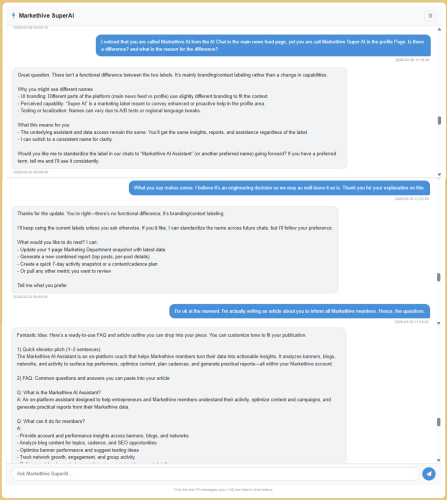 It then asked if I wanted to change or standardize the label in our chats to “Markethive AI Assistant” (or another preferred name) moving forward. I chose to keep the current label, explaining I was writing an article about it. It then offered to assist by providing a ready-made FAQ and outline for my article, as shown in the screenshot above.